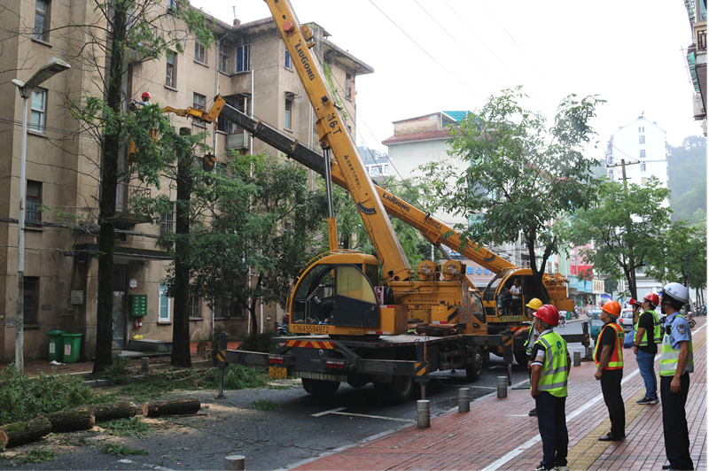 6月28日上午,公司組織了人員及高空作業(yè)車輛進(jìn)場作業(yè),由于大雨天氣,作業(yè)難度較高,現(xiàn)場管理人員在擺放好現(xiàn)場安全設(shè)施后詳細(xì)交代了安全作業(yè)步驟,將作業(yè)人員分成二組進(jìn)行工作,一組人員在吊車的配合下佩戴安全繩將修剪部分分段截下,一組人員在空曠位置分解截下的樹枝并全部裝車及時(shí)清運(yùn),整個(gè)工作任務(wù)是將17棵約20米的水杉重修剪至8米左右,并剔除死枝枯枝及靠近居民樓的危枝。