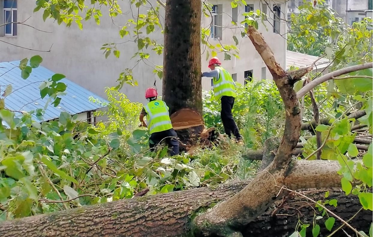 8月6日,市政園林公司派出12名城市運維人員,攜帶油鋸、折疊梯和鋼絲繩開展安全隱患排除工作。到達現(xiàn)場后,運維人員首先疏導周邊行人,設置施工警示標志,安全管理人員按照安全生產有關要求督導運維人員安全生產,確保施工過程安全無事故。