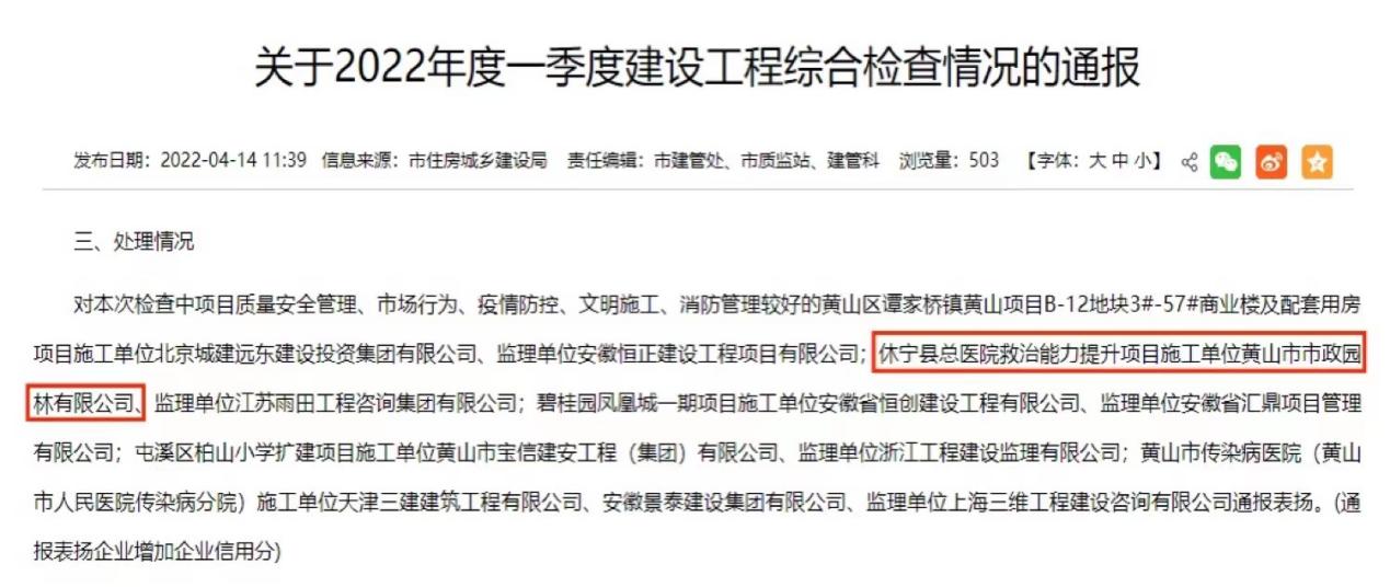 近日,市政園林公司承建的休寧縣總醫(yī)院救治能力提升項(xiàng)目在市住建局開展的2022年度一季度建設(shè)工程綜合檢查中獲得通報(bào)表揚(yáng)。