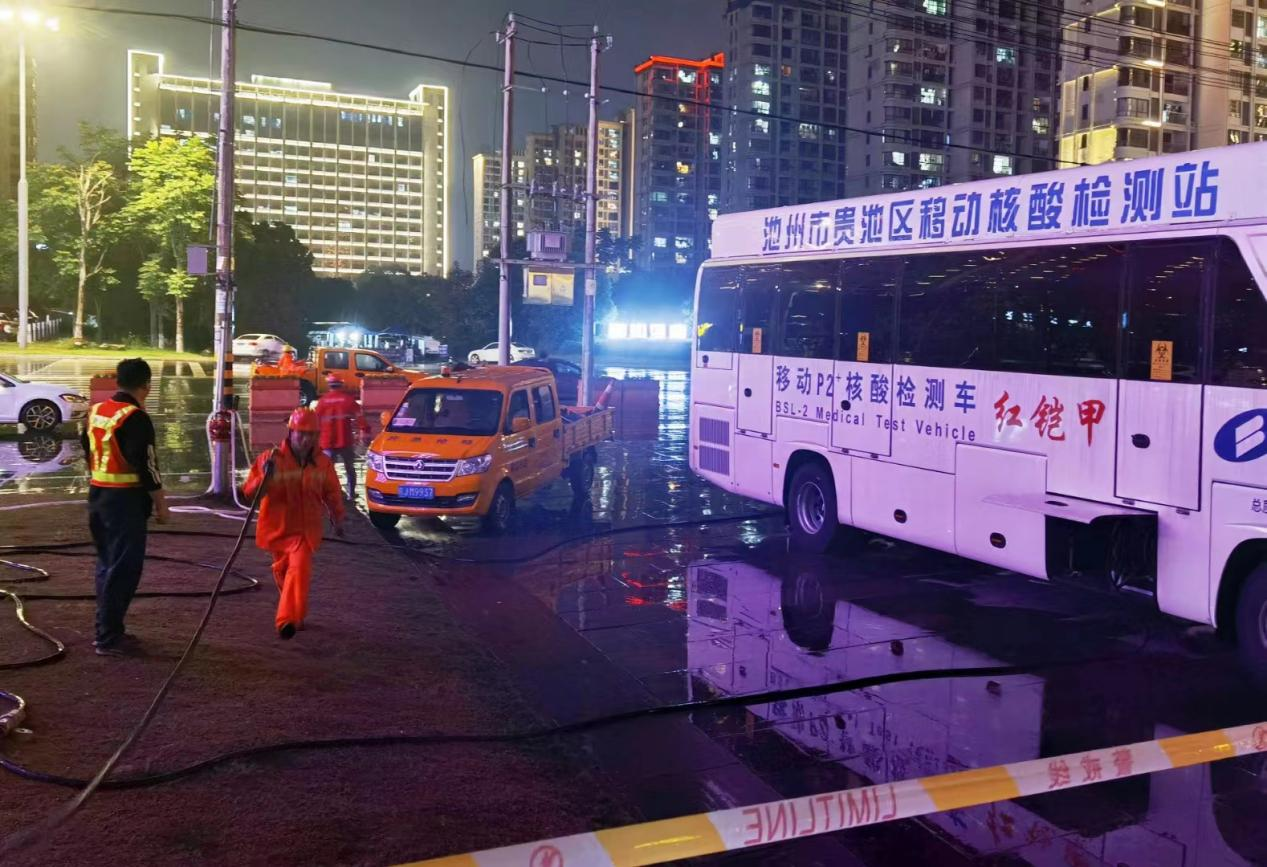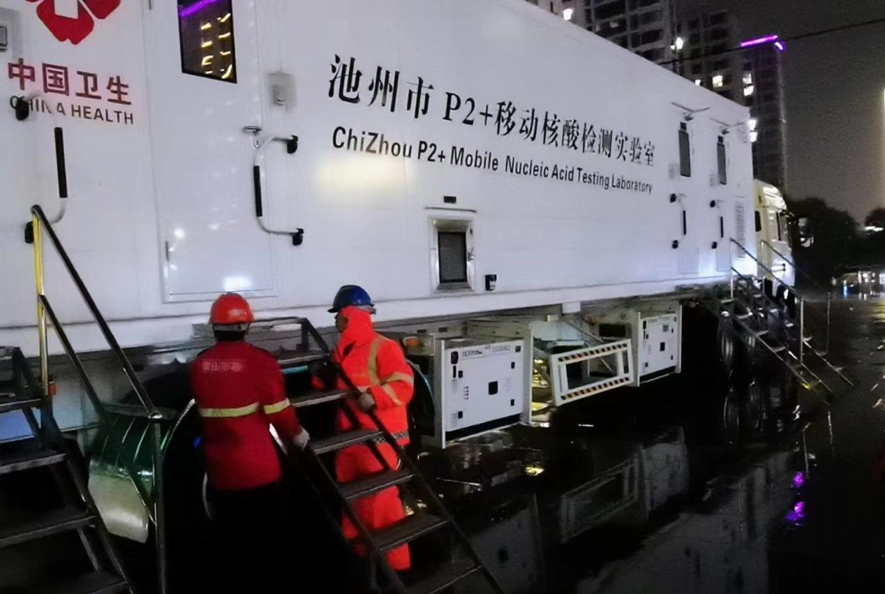 5月14號上午11點(diǎn)接到疫情防控指揮部要求協(xié)助保障池州馳援黃山移動式核酸檢測實(shí)驗(yàn)室順利開展檢測的任務(wù),公司立即啟動防控預(yù)案,快速集結(jié)專業(yè)應(yīng)急志愿隊(duì)伍,于11點(diǎn)30分8名應(yīng)急志愿者到底人民廣場開始搭設(shè)保障設(shè)施,共鋪設(shè)35平方電纜200米,自來水管50米。晚上6點(diǎn)池州檢測車到達(dá)人民廣場,應(yīng)急志愿隊(duì)伍立即冒雨開展檢測車搭建工作及接電工作,搬運(yùn)檢測物資20件,于晚上10點(diǎn)完成整體搭建工作,有利地保障了檢測工作的順利開展。