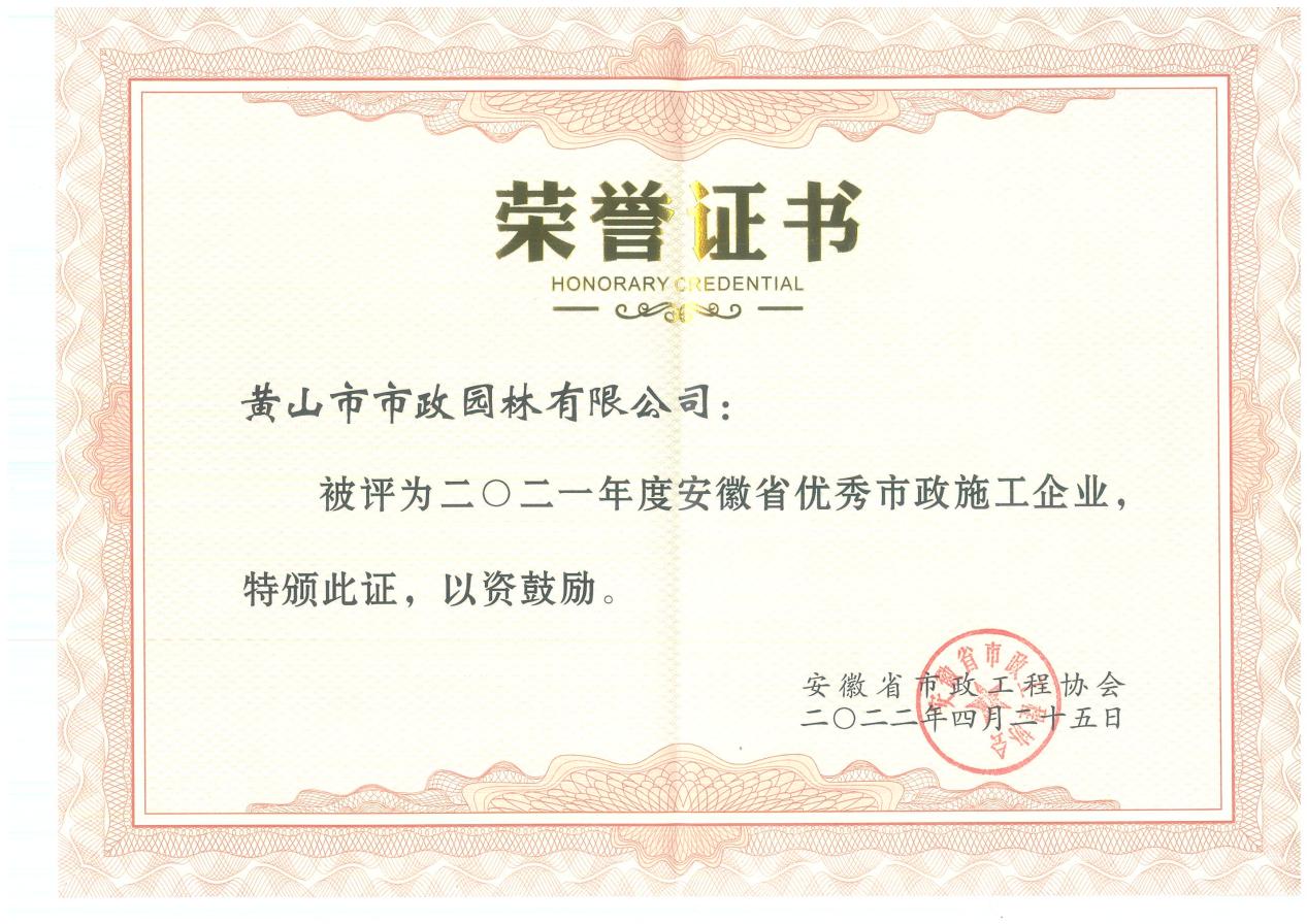 近日,黃山市市政園林有限公司被安徽省市政工程協(xié)會授予“2021年度安徽省優(yōu)秀市政施工企業(yè)”稱號,這是公司獲評“2021年度黃山市優(yōu)秀建筑企業(yè)”“黃山市安全生產(chǎn)標(biāo)準(zhǔn)化示范工地”“市優(yōu)質(zhì)工程迎客松杯”等稱號后,獲得的又一重要榮譽。