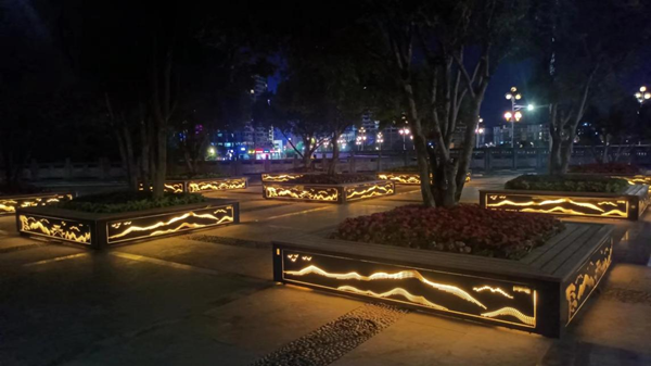 該項目由市政園林公司負(fù)責(zé)實施,主要對大樹樹池進行修繕,將破損的樹池防腐木更換成智能座椅并安裝無線手機充電設(shè)施,方便行人在炎熱的夏季駐足休憩;對樹池四周加裝徽州山水、迎客松、馬頭墻等徽州元素的鏤空不銹鋼裝飾板,提升夜景觀賞性的同時宣傳了徽文化;對現(xiàn)有苗木進行修剪,樹池內(nèi)種植五星花、大巖桐等色帶,通過增色添彩的方式進一步提升城市綠化品質(zhì)。