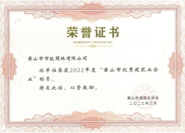 2023年3月,黃山市市政園林有限公司再次榮獲黃山市建筑業(yè)“優(yōu)秀企業(yè)”稱號。此次表彰,體現(xiàn)了政府部門、業(yè)主和監(jiān)理等各方對我公司建設(shè)質(zhì)量及管理水平的高度認可,也是公司不斷前進發(fā)展的根本,是公司全體員工不斷進取,狠抓工程質(zhì)量,不斷提高管理水平的重要體現(xiàn)。