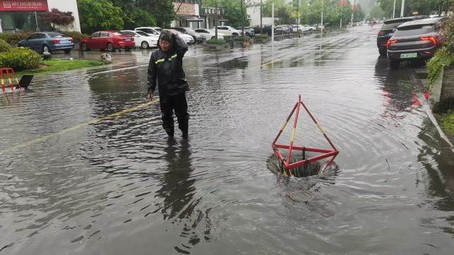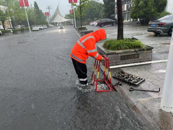 搶險現(xiàn)場,“高壓沖洗車+人工清掏”組合模式顯實效。針對15處嚴重堵塞點,高壓水槍精準沖擊管道淤積物,配合人工清理落葉雜物,排水效率提升40%。針對打開的25處雨水箅,搶險隊創(chuàng)新設置“雙層防護欄+反光警示牌+防爆警示燈”三重防護,并增派15名隊員配合交警實施交通管制,保障市民通行安全。